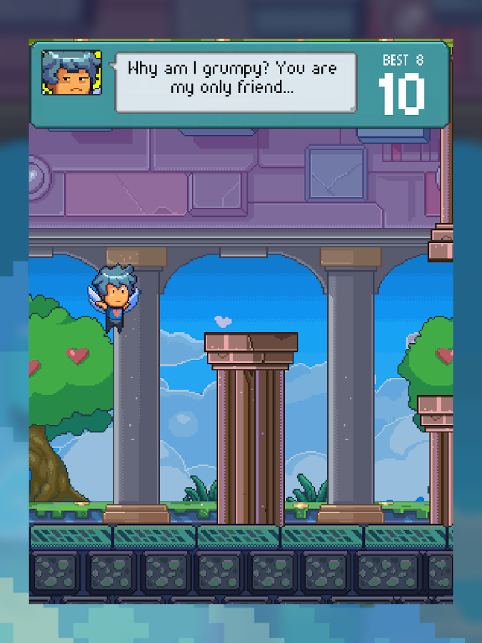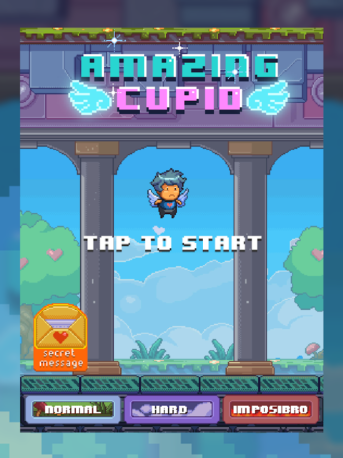 There's also a game called Amazing Cupid, which adds a few twists. First, you tap to fall, not to fly. Second, the goal is not only to pass a ton of obstacles, but to reach your goal to read a secret note from a friend. If you don't meet the goal, the messages is lost forever.